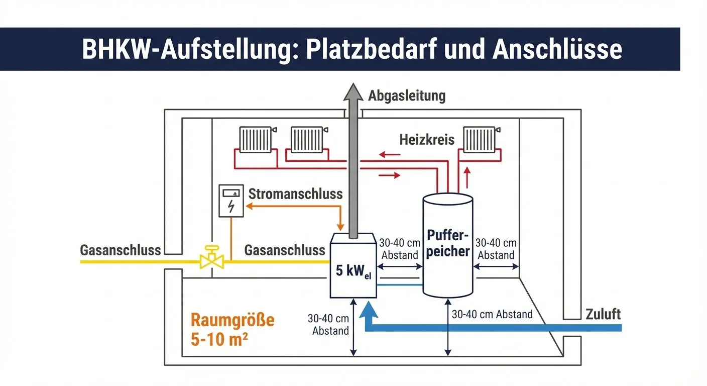 Ein BHKW benötigt je nach Größe 4–15 m² Stellfläche inklusive Pufferspeicher. Die Installation umfasst sechs Schritte: räumliche, hydraulische, elektrische und steuerungstechnische Einbindung sowie Brennstoffversorgung und Abgasführung. Die jährlichen Wartungskosten liegen bei 500–1.500 Euro, die Gesamtbetriebskosten (Gas, Wartung, Versicherung, Schornsteinfeger) bei 3.000–8.000 Euro pro Jahr. Ein Vollwartungsvertrag mit dem Hersteller sichert Sie gegen unerwartete Reparaturen ab.