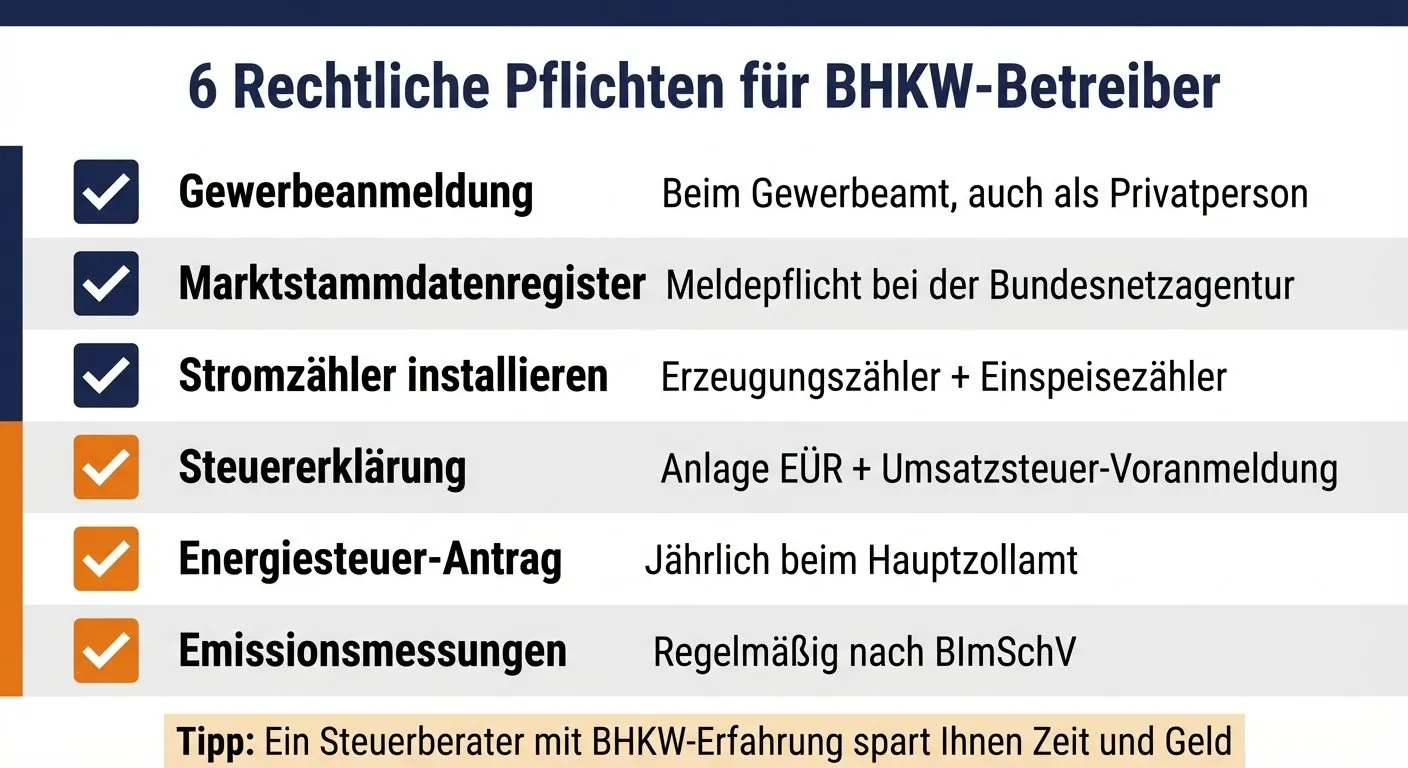 Nach Installation: Gewerbe anmelden. BHKW beim Netzbetreiber und bei der BAFA anmelden (Zulassung nach KWKG beantragen).