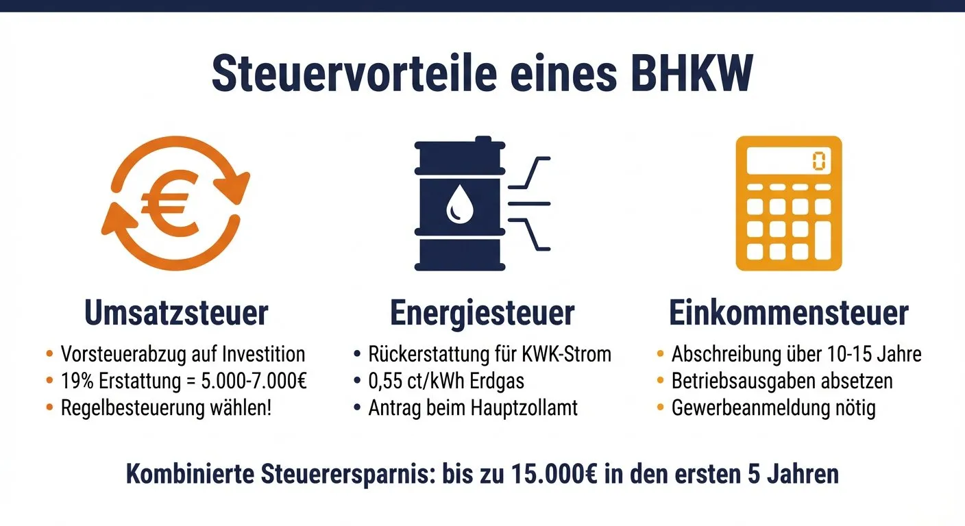 Ein BHKW bietet erhebliche steuerliche Vorteile. Der Vorsteuerabzug allein kann mehrere tausend Euro betragen. Hinzu kommen die Energiesteuer-Erstattung, die Abschreibung und der KWK-Zuschlag. Vermieter profitieren zusätzlich vom Mieterstrom-Modell.